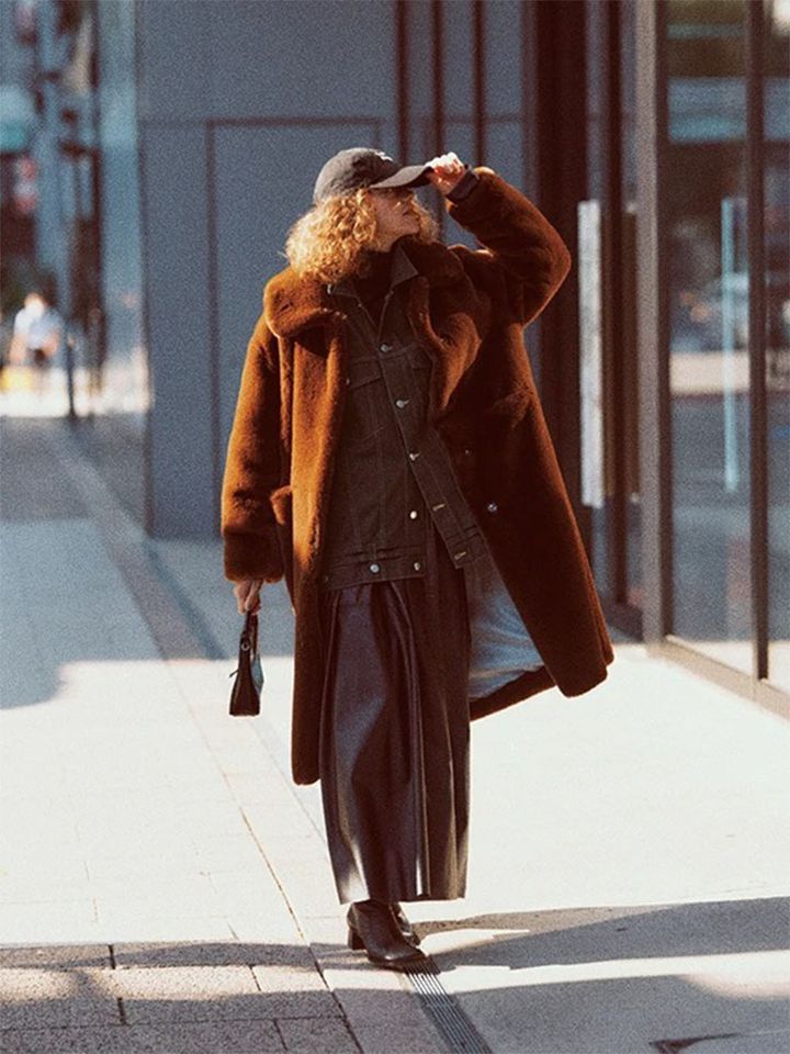 濃厚なインディゴのGジャンがもつラフさに対して、女性らしい気品が漂うフォギーな質感を投入。オーバーサイズのデニムジャケットには、ビッグフォルムのファー素材で強気に出るくらいがベストバランス。一番外側の色みも落ち着いて、親しみやすいカジュアルに着地。