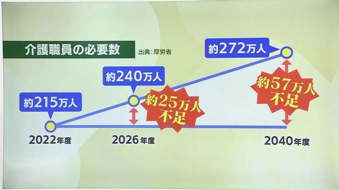 しかし、このまま介護職員が増えなければ2040年には、およそ57万人が不足することが厚労省の推計でわかりました。