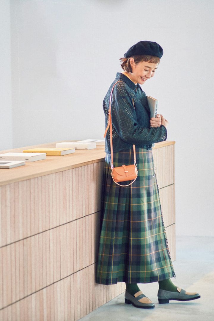 シャツ¥24,200/ル シェル ド ハリス(金万)、ニット¥28,600/エンリカ(アッシュプラスエリオトロープ)、スカート¥36,080/オニール オブ ダブリン(ビショップ)、バッグ¥13,200/バイス ベルサ(セムインターナショナル)、ベレー帽¥9,350/ロレール(クオリネスト)