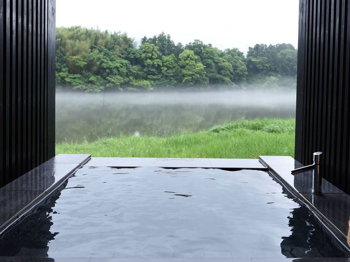 全客室に露天風呂付きで、泉質は弱アルカリ性で弱食塩泉のため美肌や冷え性にも効く。自然と一体になった気分で入浴できる、インフィニティ温泉大浴場にもファン多数。