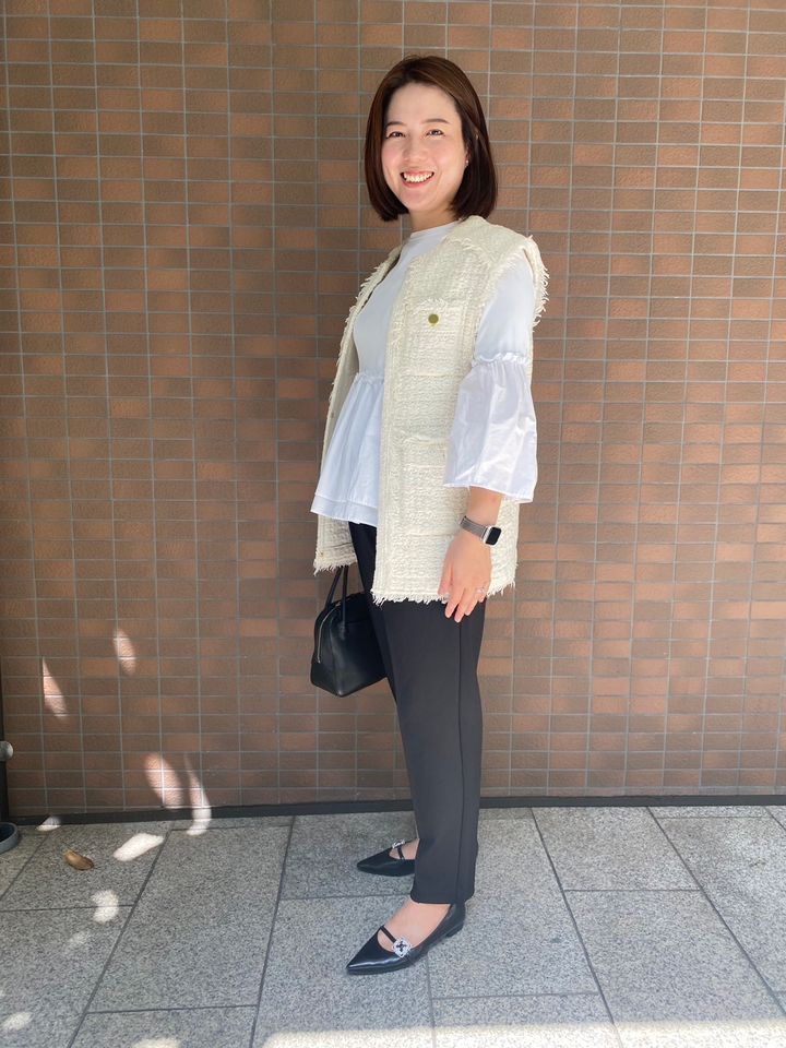 「ご祈祷は神田明神を予定。当日はバタバタで家族全員疲れると思うので、主役だけ着物にしてほかのメンバーは洋装にしようと思っています。ブラウスにジレを合わせるときちんと感と華やかさが増すような気がしてこちらを着ていく予定。長女のときにお詣りと撮影を別日にして正解だったので、今回は予約が取れやすくなる来年春に、長女の二度目の七五三の前撮りと合わせて後撮りとして撮影をしようと思っています」原 愛子さん・33歳/金融関係勤務・162㎝(3歳と6歳の女の子ママ)