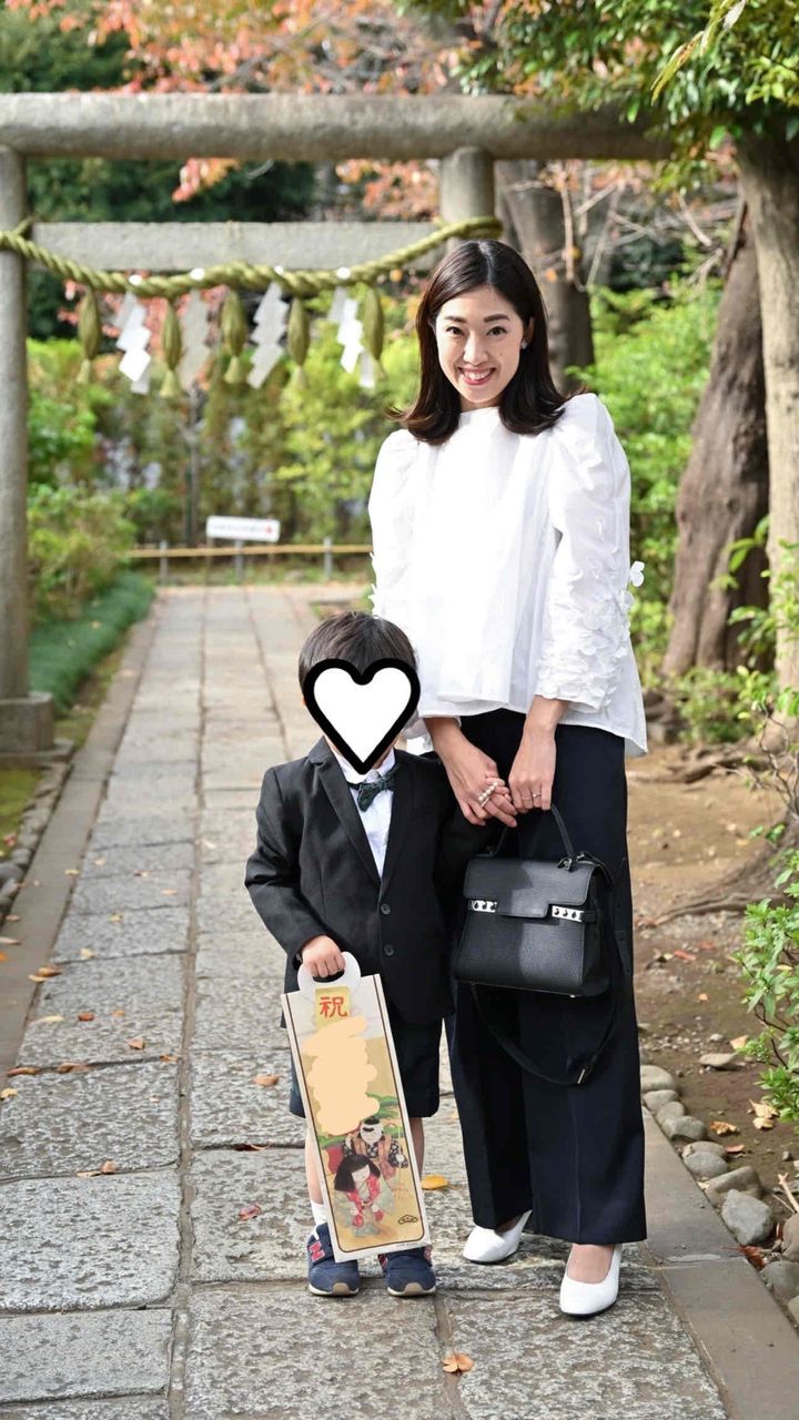 「3人目となると和装、洋装、スタジオ撮影、出張撮影すべて経験済み。初めての七五三は形式にこだわりすぎてスケジュールも詰め込み、慣れない着物でせっかくのハレの日も苦痛になってしまったので、親子ともに楽しく過ごせて天候にも左右されない洋装を選びました。私は大好きなシロコンの華やかなブラウスに、パンツはネイビーを合わせてシンプルに。七五三を決めたのが前日だったので息子は兄のお下がりと足元はスニーカーでかなりカジュアルでしたが、帰りはみんなでクレープを食べたりして楽しく過ごせました」泉 翠さん/会社員・38歳・160㎝(11歳の女の子と8歳と6歳の男の子ママ)