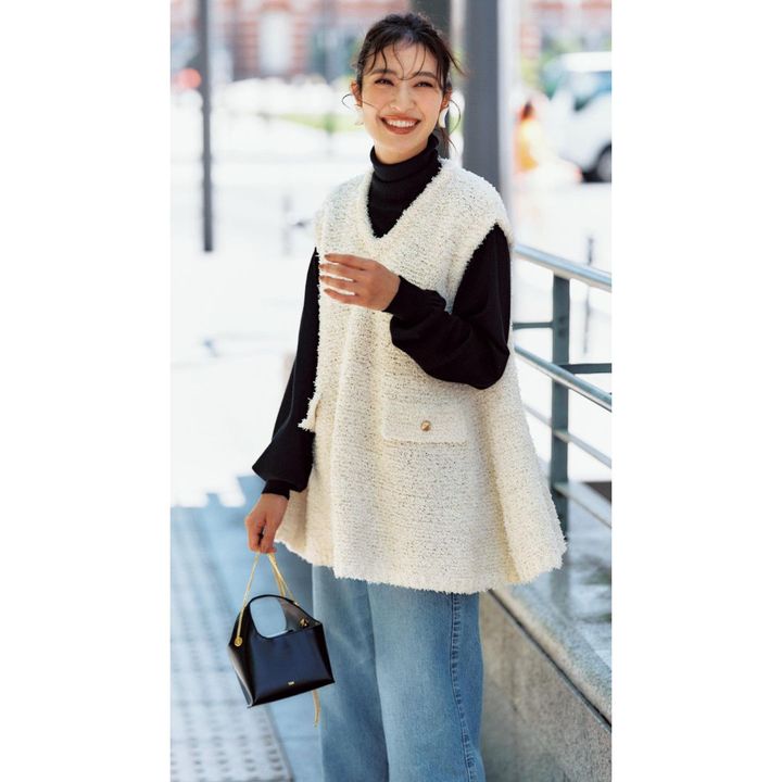脚長効果を狙えるクロップド丈ジレに 白のシアータートルをINして軽やかに。 上品なツイードでよそ行きオシャレに