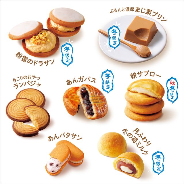 柳月特製つぶあんの焼き菓子「あんガバス」、キャラメルバターのサンドスイーツ「粉雪のドラサン」、もっちりサブレの「餅サブロー」、まるで、モンブランのように濃厚な「ぷるんと濃厚 まじ栗プリン」、苺ミルクの癒やし「月ふわり 冬の苺ミルク」の冬限定5商品と「あんバタサン」と「きこりのおやつ ランバジャ」の定番2商品が入っています。