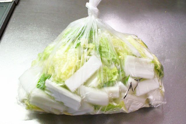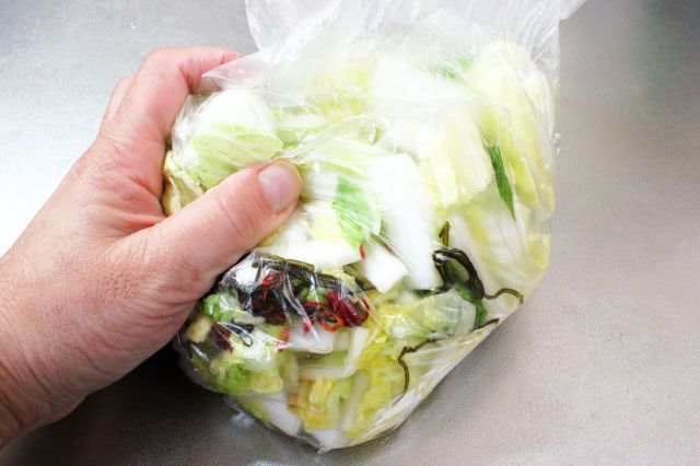 4. 白菜の水分が出てきたら袋の上から揉み、空気を抜いて口を結び直します。