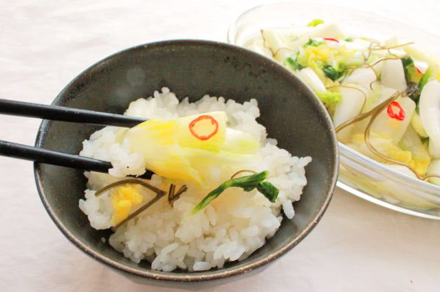 では、炊き立てのご飯といただきます♪食べるや否やビックリ!市販品と同レベルのおいしさです。動画のタイトルに「市販はもう買わない」とあったのですが、その通りの印象!ほんのりと酸味のある調味液に昆布の旨味が染みているので、酸っぱさが軽減され、白菜の甘みが引き立っていますよ。