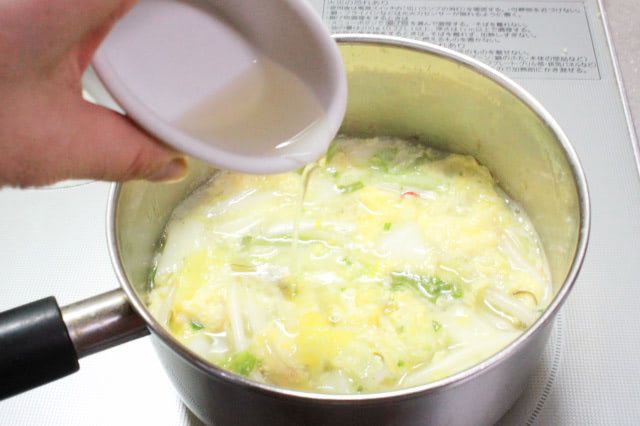 溶き卵がふわっと固まったら火を止め、酢を大さじ1だけ加えました。大さじ2を加えるとしっかり酸味が付くそうなので、酸味が強いラーメンがお好きな方は、大さじ2の分量で入れてくださいね。