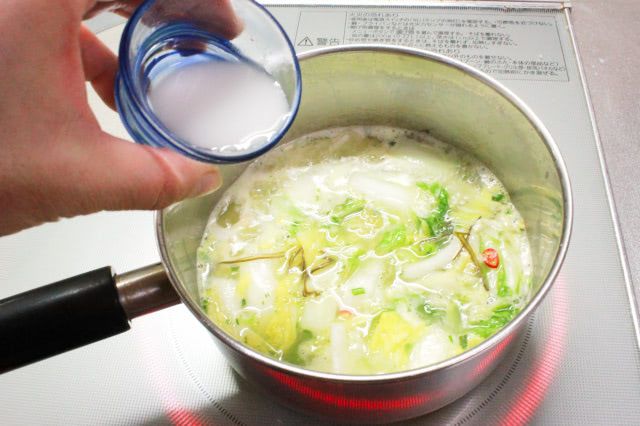 2. 付属の粉末スープを溶かして、もやしと白菜の浅漬けを加えます。スープが沸いたら、水溶き片栗粉を加えてとろみを付けます。