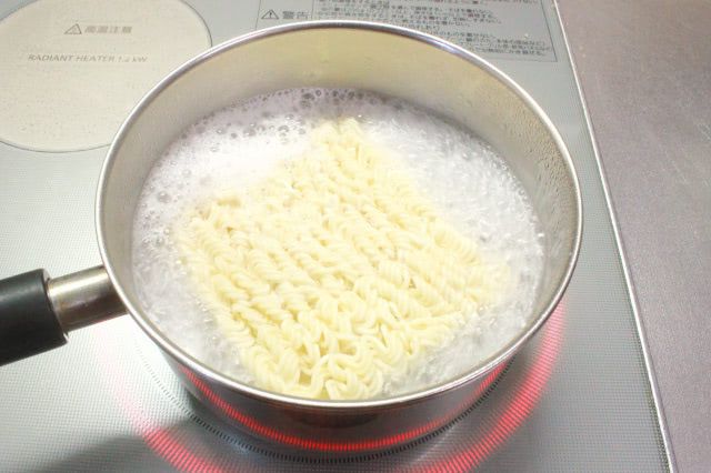 1. 袋麺の表示通りの量の水(分量外)を鍋で沸かし、麺をほぐしながら表示時間より1分短く茹でます。