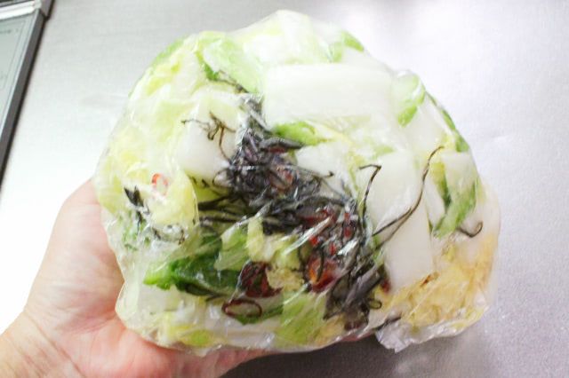 1時間ほど置いておくと白菜から水分が少し出て、底の白菜がしっとりとしていました。そこで、結んでいた袋の口を一度開き、袋の上から揉んで調味料をなじませ、空気を抜いて口を閉じました。