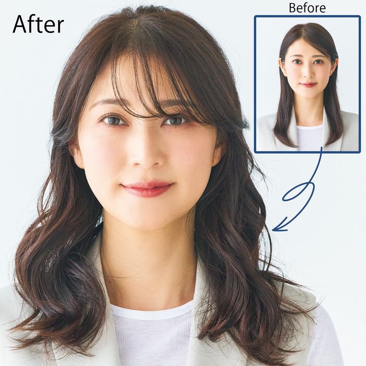 ドライ時に根元をしっかりと立ち上げて、トップに自然な厚みが生まれました。全体をしっかりと巻いたのでボリューム感も出ています。