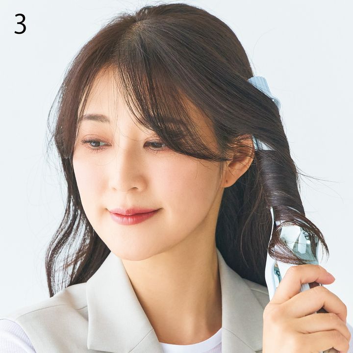 顔周りも根元が立ち上がるように巻きます。まずは前髪を大きなカールに巻き、サイドバングは毛先が後ろに流れるように整えて。
