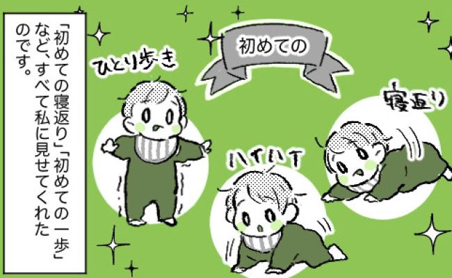 専業主婦だった私は息子と一緒にいられる時間が多かったため、「初めての寝返り」、「初めてのハイハイ」、「初めての1歩」などを見逃すことはありませんでした。息子は成長していく中で、さまざまな「初めて」をすべて私に見せてくれたのです。