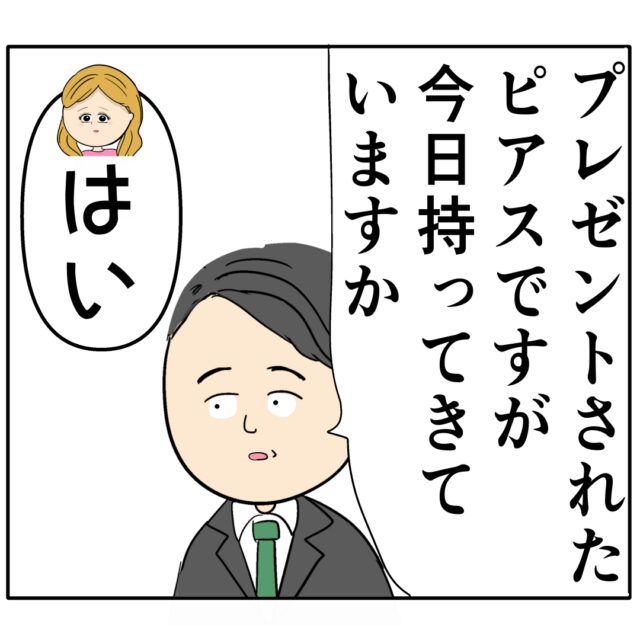 「プレゼントされたピアスですが、今日持ってきていますか?」課長の質問に「はい」ふり子さんが答えました。