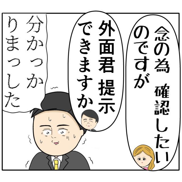 「念のため確認したいのですが・・」ふり子さんの言葉を受けて「外面くん、提示できますか?」部長がたずね、「わっか・・かりました」外面さんは焦りながらもトーク履歴を探します。