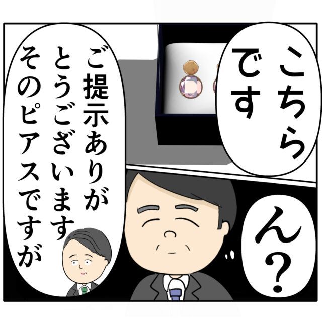 「こちらです」ふり子さんが差し出したピアスを見て「ん?」と呟く部長、課長は「ご提示ありがとうございます。そのピアスですが」と切り出しました。