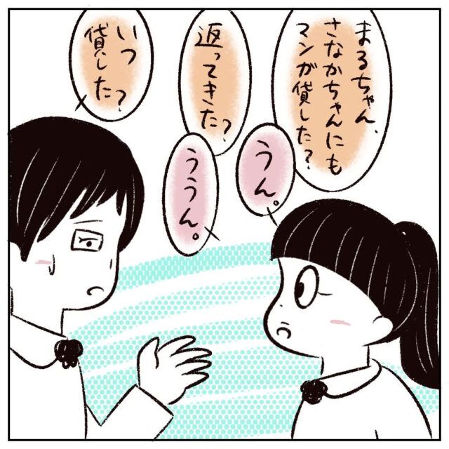 「まるちゃん、さなかちゃんにもマンガ貸した?」と聞かれ「うん」と答えると「返ってきた?いつかした?」と不安そうに聞きます。