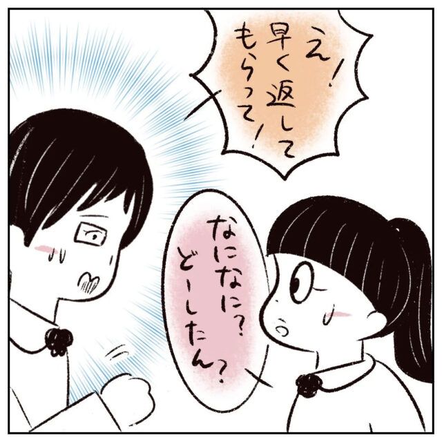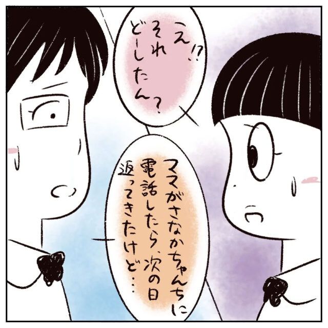 まるさんは驚いた様子で「え!?それどーしたん?」と聞くと「ママがさなかちゃんちに電話したら、次の日返ってきたけど・・・」と言いました。