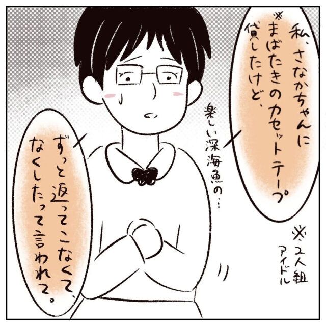 「私、さなかちゃんにまばたきのカセットテープ貸したけど、ずっと返ってこなくて、無くしたって言われて。」と言いました。