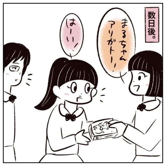 数日後。まるさんにマンガを借りていたヨーちゃんが「まるちゃんありがとー!」と返し、「はーい!」とマンガを受け取ったまるさんたちの様子を見ていたお友達がア焦った様子で近づいてきました。