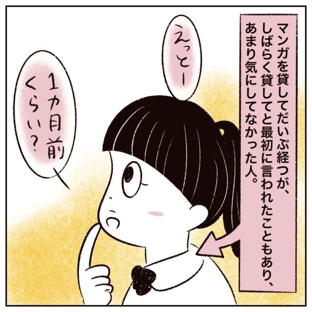 マンガを貸してだいぶ時間が経っていましたが、最初からしばらく貸してと言われていたのであまり気にしていなかったまるさは、何も疑わず「えーと、1ヶ月前くらい?」と答えました。