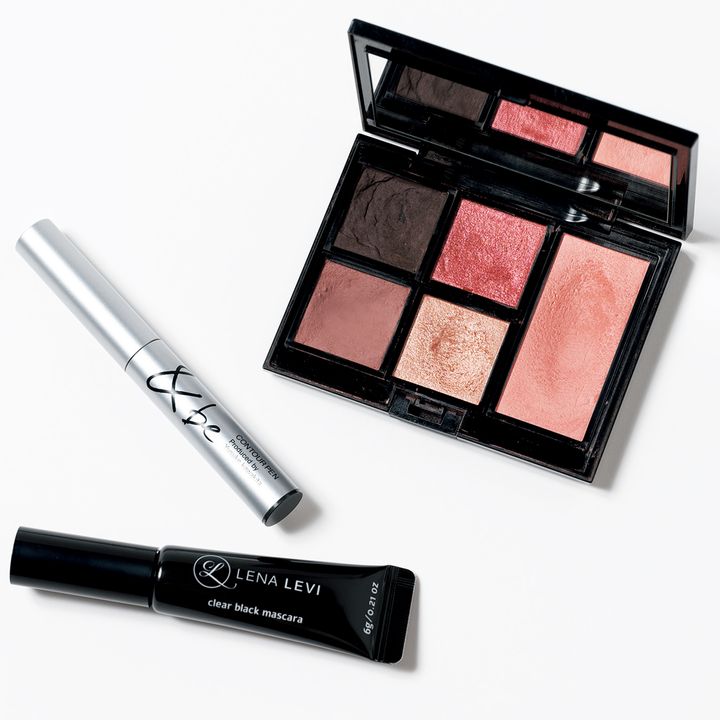 アディクションのアイシャドウは5色全て自分で選ぶことができるカスタムパレット。チークやハイライトも入ってます。&beのコントゥアペンは輪郭に沿ってぼかすと簡単にシェーディング可能。LENA LEVIの眉マスカラで細い眉毛を根元から立たせ存在感を出します。