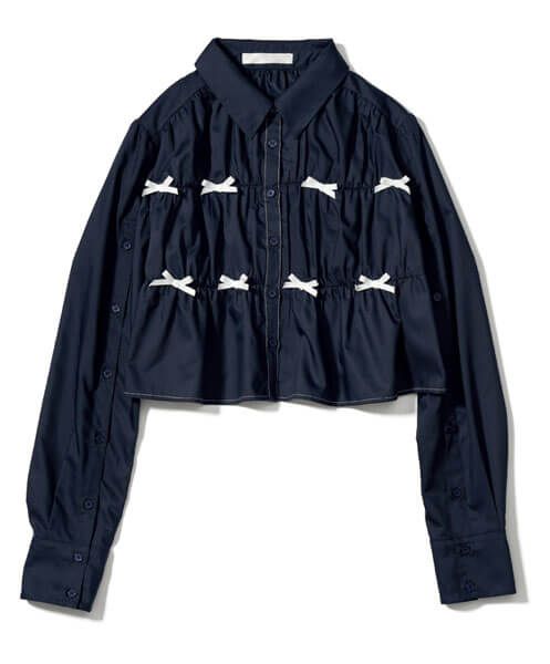 ギャザー&白リボンできれいめシャツに甘さをひとさじ