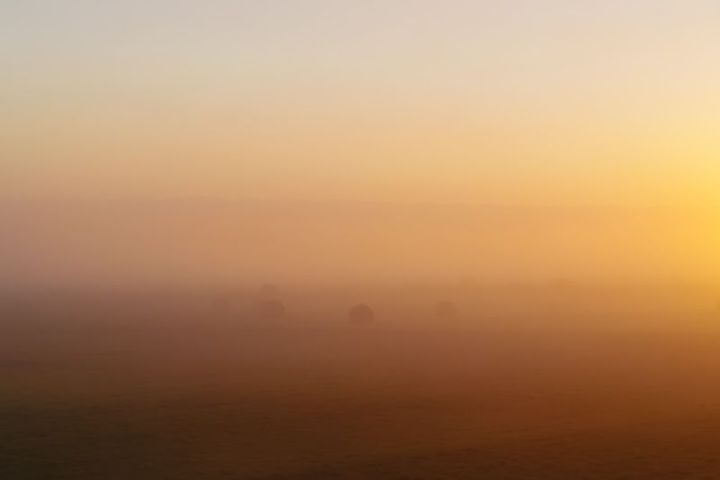 ゆっくりと昇ってきた太陽が、朝霧を柔らかいオレンジ色に染めます。