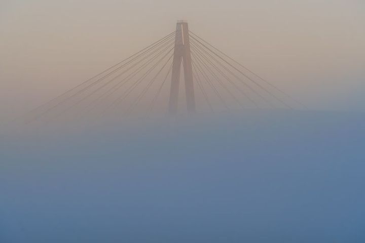 十勝川白鳥大橋も、すっぽり朝霧に覆われていて、見えているのは橋のシンボルのアーチの部分だけです。
