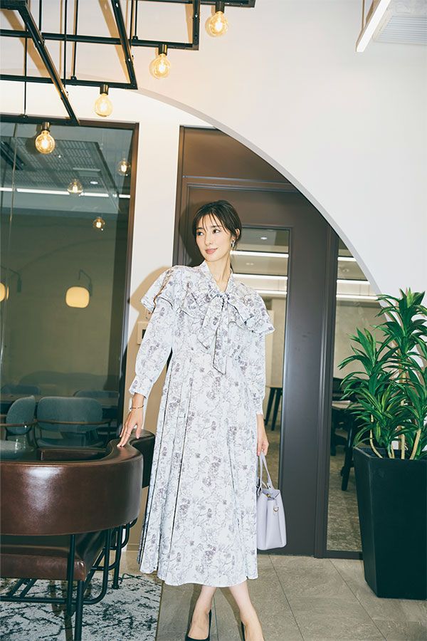 ワンピース(ケープ取り外し可)¥7,590/tocco closet イヤリング¥3,600/ラルク、バングル¥3,400、リング¥3,740/ともにKRONOS(以上ロードス) バッグ¥10,230/PROPORTION BODY DRESSING シューズ¥26,400/銀座かねまつ(銀座かねまつ6丁目本店)