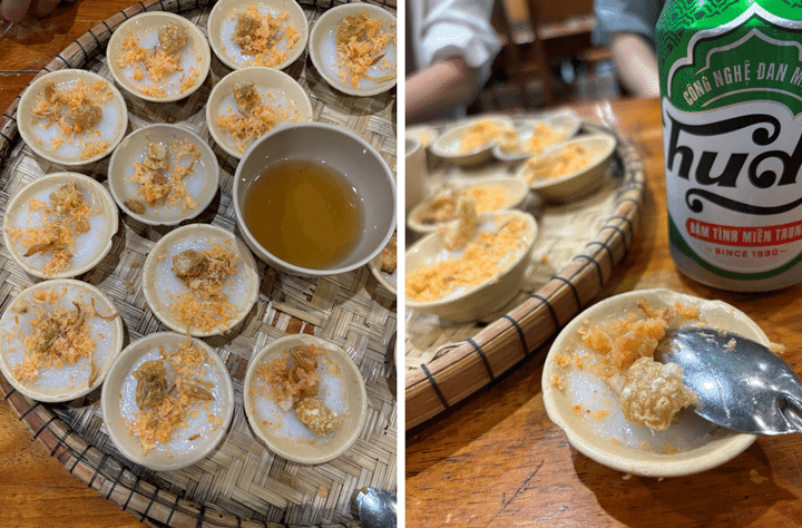 たとえばバインベオ。ベトナム全土にある料理ですが、フエのバインベオは生地を小皿に入れて蒸し、仕上げに干しえびをのせて仕上げます。米粉生地なので、食感はもちもち! ほかにもバインナム、バインエップなど、まだ食べられていないバイン料理がたくさん💦
