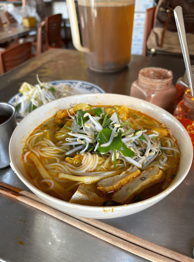 たとえば、日本でもたまに見かけるブンボーフエ。ブンは米粉で作った丸麺、ボーは牛肉のこと。牛のだしがよく出ているスープはピリ辛で絶品! スープの味や牛肉の形状などに個性が出るので、いろいろ食べ比べるのが楽しい。相場は3万~4万ドン(180~240円)でしょうか。ベトナムの麺料理といえばフォーが定番ですが、フォーをあまり見かけないほど、フエでは麺といえばブンのようです。