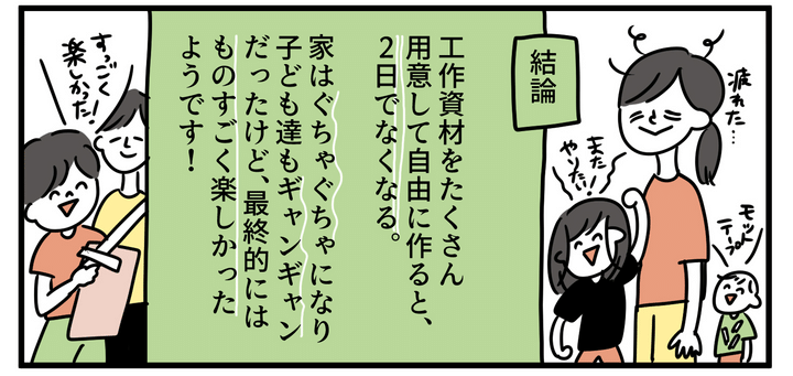 ただ、わが家の場合は家の中も子どもたちの情緒もぐっちゃぐちゃになったので、今回よりも盛大に工作をするとなったら覚悟が必要そうです…。親は大変だったけれど、子どもたちからの評判は最高によかったです。なにせ前代未聞の2日間連続でやるくらい大好評でしたし。