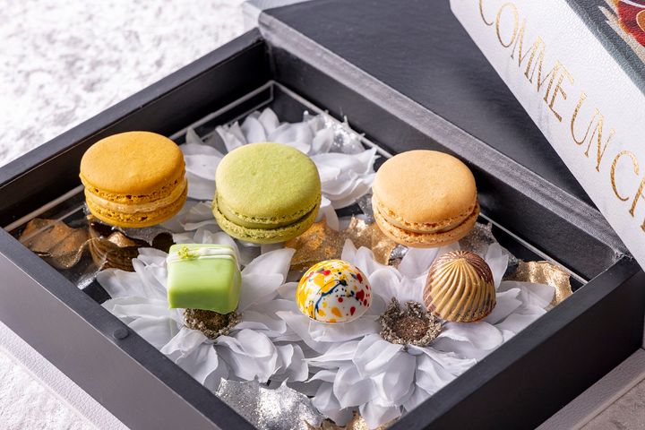 スイーツBOX 上左から:マカロンアンフィニマンカラメル、マカロンアンフィニマンピスターシュ、マカロンアンフィニマンジャスマン、下左から:ライム、ラズベリー、ヘーゼルナッツのチョコレートボンボン