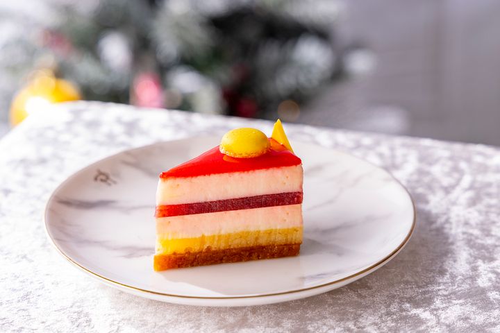 チーズケーキセレストルバーブとイチゴの甘酸っぱい香りと味わいを引き立てるベイクドチーズケーキとチーズムースの二層の優しい味わい。さくさくとしたサブレの土台にパッションフルーツ風味のビスキュイが食感のアクセントになっています。