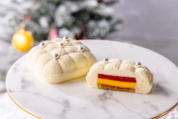 ホワイトチョコレート&ストロベリーピローイチゴのジュレ、マンゴークリーム、ピスタチオのビスキュイをホワイトチョコレートのムースで優しく包んだ、キンプトン東京のパティシエの腕が光るなめらかなケーキ。