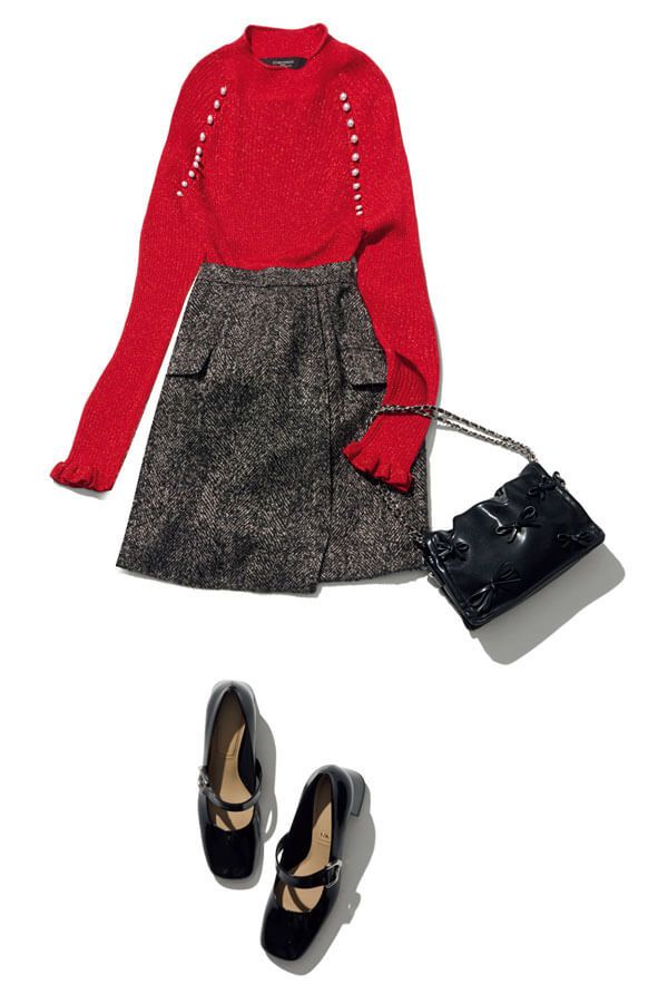 鮮烈な赤をぶつけて黒ベースのミニスカを小粋に