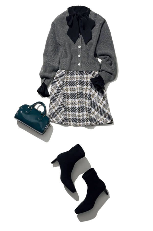 スカート¥9,790/31 Sons de mode(ヒロタ) カーディガン¥19,800/マイストラーダ ブラウス¥6,930/MISCH MASCH バッグ¥13,200/アンタイトル 靴¥13,970/RANDA