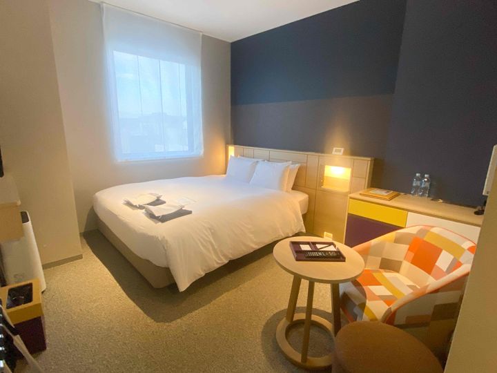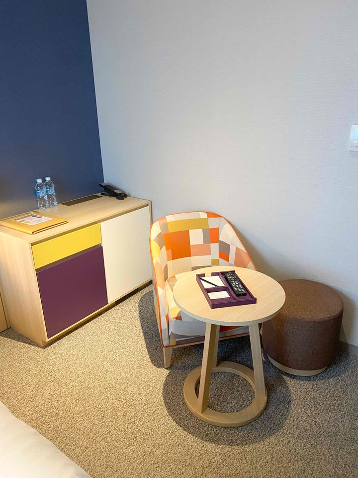 今回宿泊したのは、ひとり旅やカップル、夫婦での宿泊に最適な「スタンダードダブル」の客室です。一面がブルーの壁紙や、カラフルなデザインチェアがすてき。