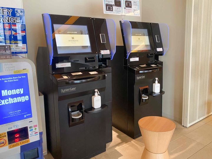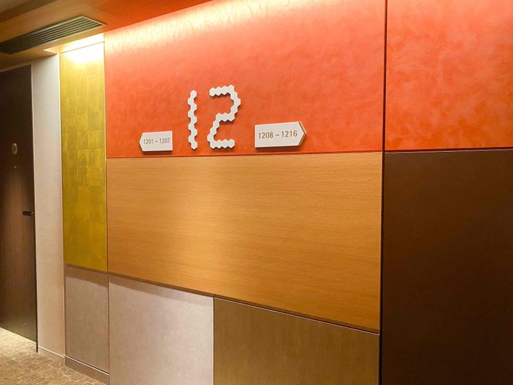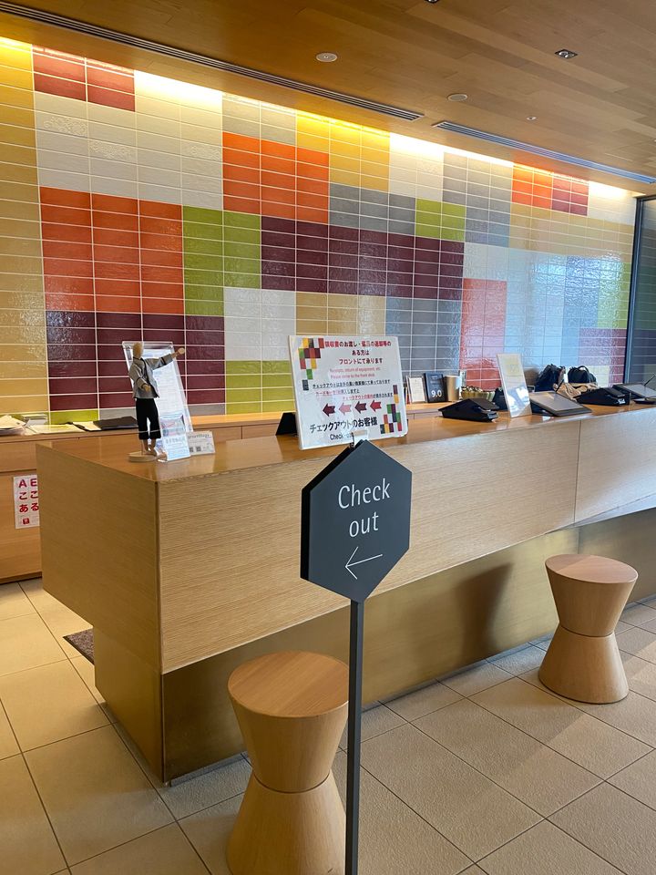 施設内に入ると、加賀五彩と石垣をモチーフにしたチェックインカウンターが、迎えてくれました。気分が華やぐカラーやデザインが印象的。