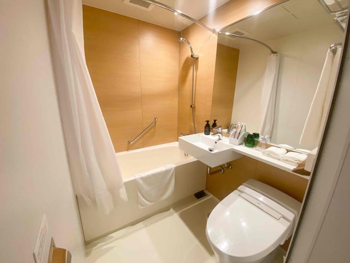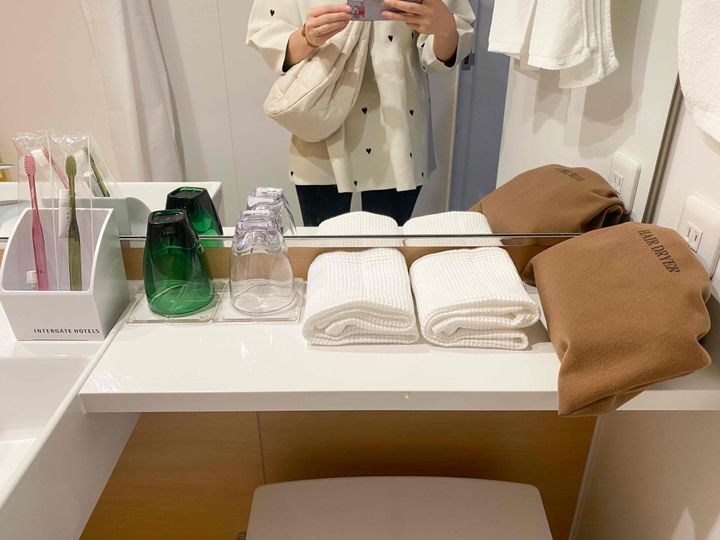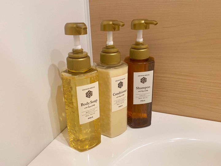 お風呂場に、アメニティは歯ブラシやシャンプー類のみ設置されています。コットンや綿棒などは、1階のエントランスから必要なものを取ってくるシステムです。