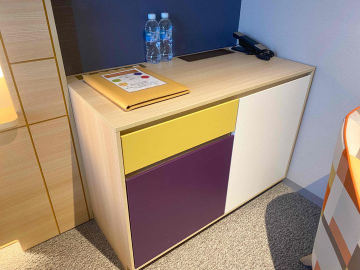 無料のペットボトルのお水が2本と、棚の中には冷蔵庫や電気ケトル、お茶セットも用意されていました!