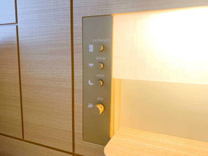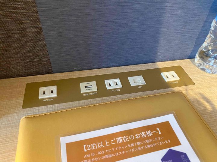 コンセントやUSBポートは、ベッドサイドと棚の上にもあります。