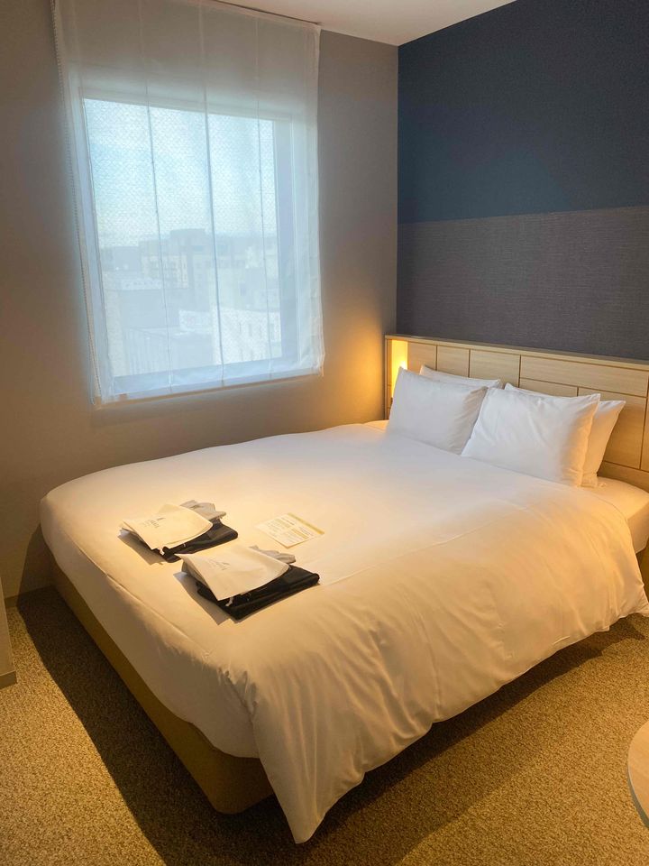 ダブルベッドには、ふかふかな枕が4個、上下セパレートのルームウェアが2着置いてありました。