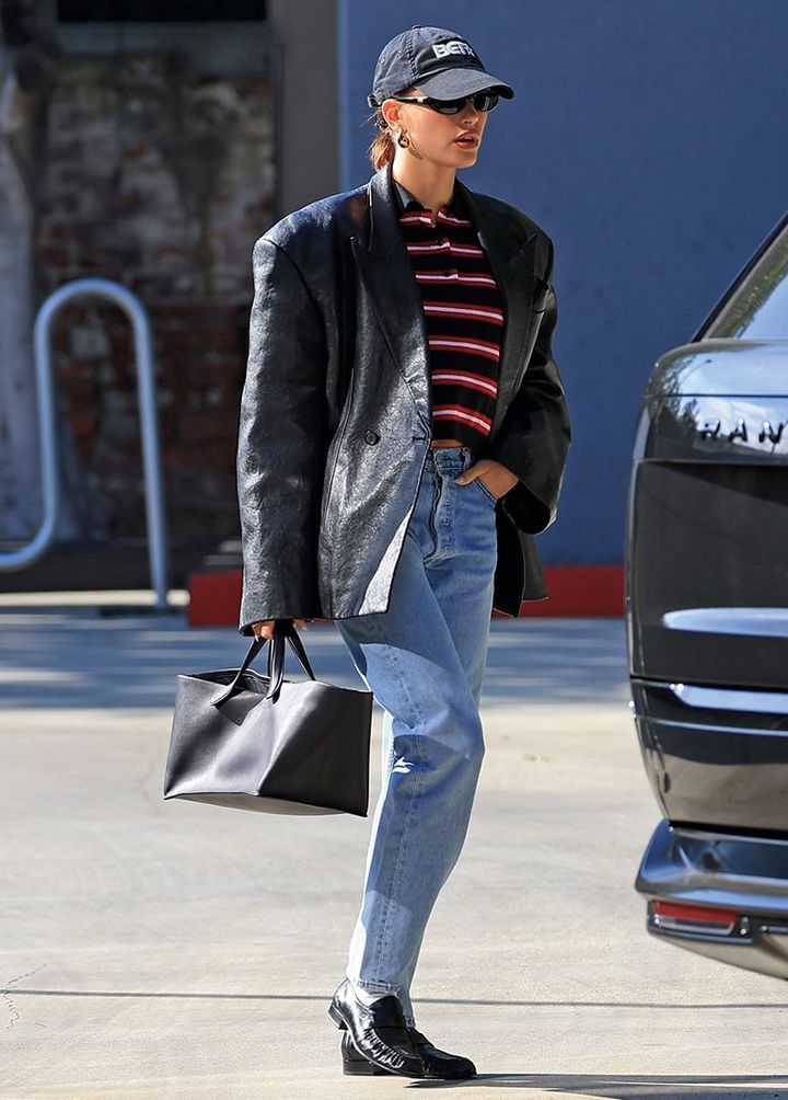 ヘイリー・ビーバー ❶オーバーサイズのレザージャケットをヘルシーに着る!