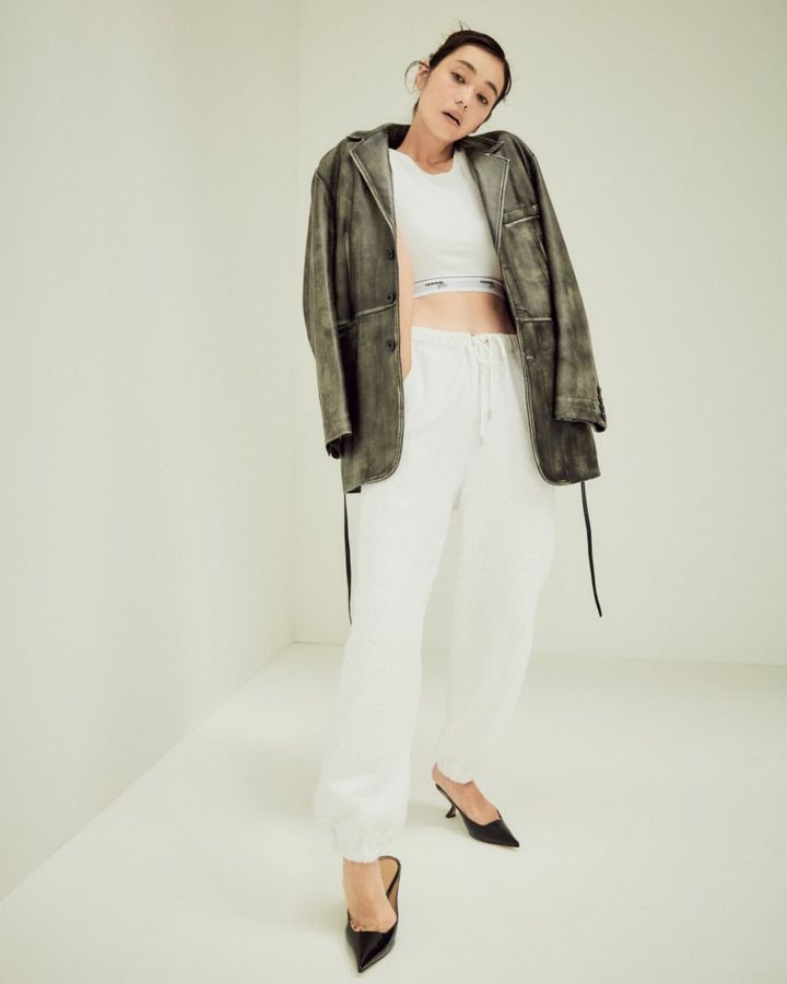 レザージャケット¥39,600(メゾンスペシャル/メゾンスペシャル 青山店)、ブラトップ¥13,200(オム ガールズ/アダム エ ロペ)、スエットパンツ¥29,700(オールド イングランド/オールド イングランド銀座店)、シューズ¥72,600(ペリーコ/アマン)