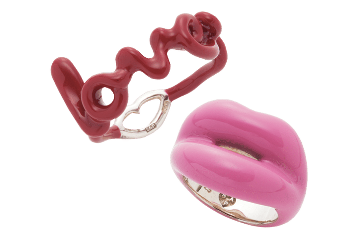 ポイントになるキャッチーなアクセも。LOVEリング¥47,300、リップリング¥53,900(共にホットリップス/トゥモローランド)