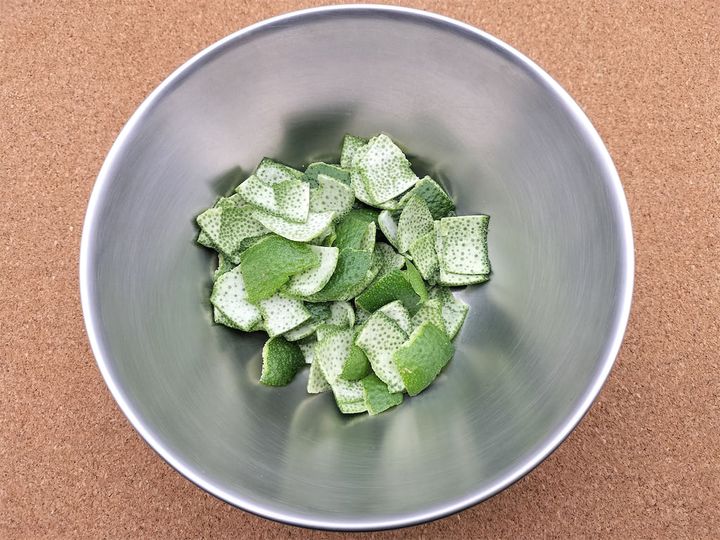 2. 皮に付いた白いわたはできるだけ取り除き、適当な大きさに切っておきます。
