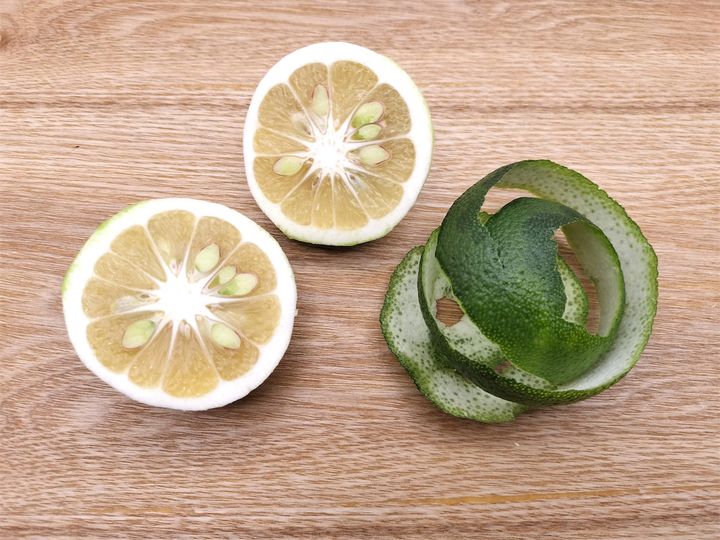 1. かぼすの皮をりんごを剥くようにくるくると剥き、実は半分に切って果汁を絞っておきます。