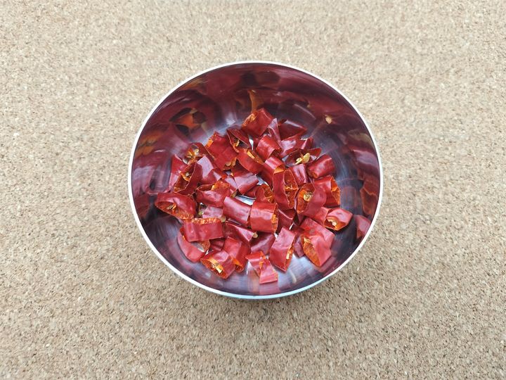 3. 赤唐辛子のタネとヘタをとり、小さく切ります。